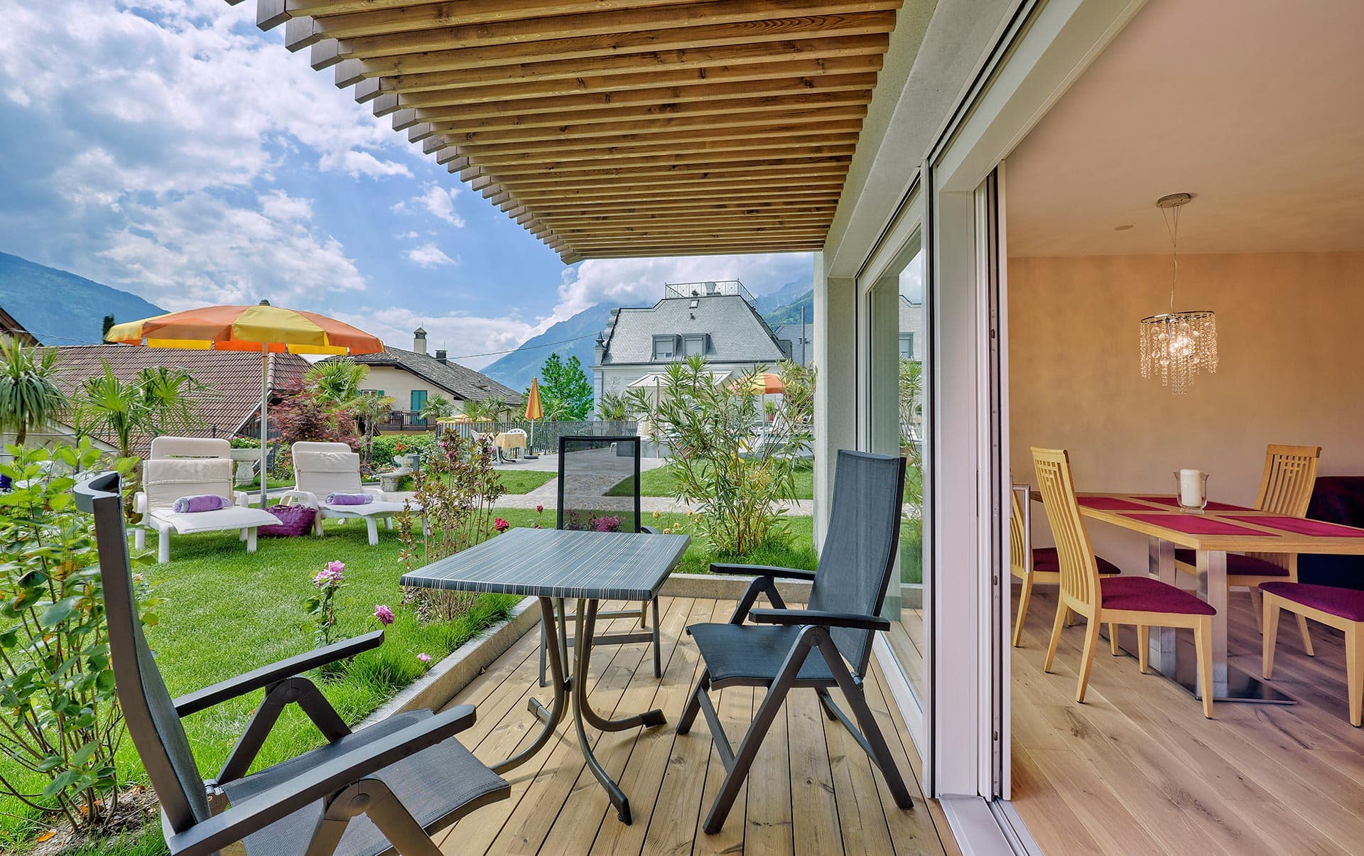 Hotel Garni Zimmer und moderne Ferienwohnungen mit Balkon oder Terrasse, Dusche, WC, Fernseher und herrlicher Aussicht auf die umliegenden Berge.